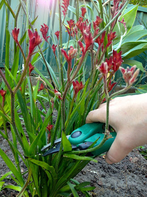 This is the hard part, well not really, I'd describe it more as heart-breaking. To prune Kangaroo Paws you need to cut the stem quite close to the ground. It is good to cut off the dull bits and prune heavily at the end of the flowering season to ensure beautiful flowering in subsequent seasons. When pruning, leave the newer green shoots or around one third of the plant if you can.